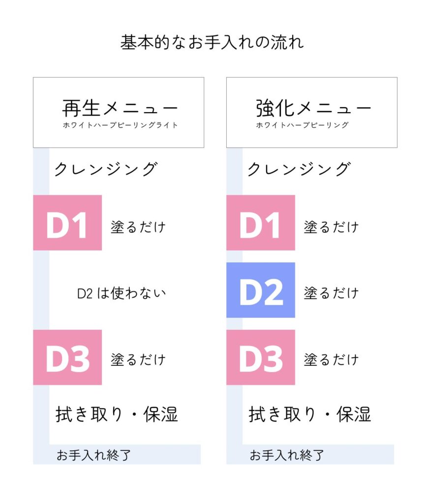 ※「再生」メニューホワイトハーブピーリングライトのお手入れでは、下記【[3] D2の塗布】を省略します