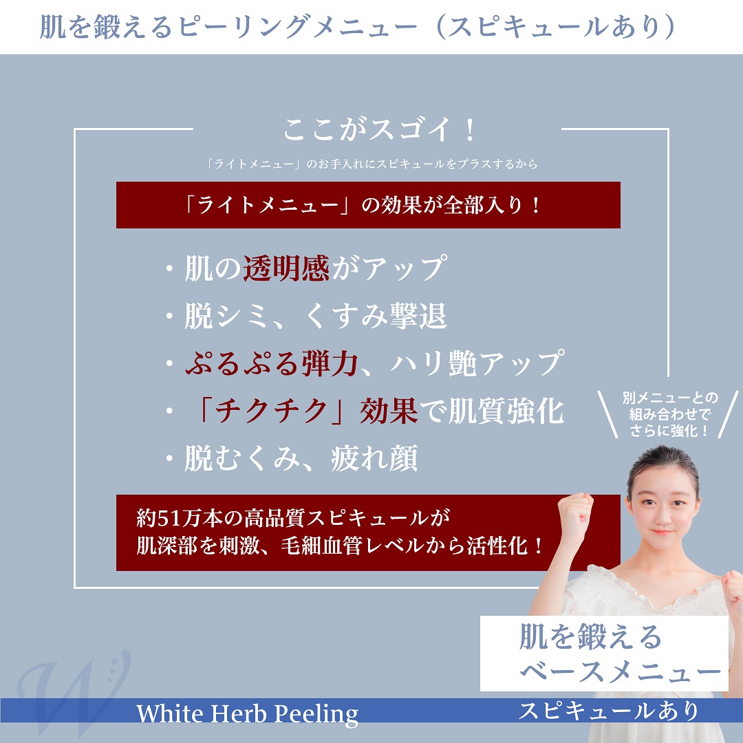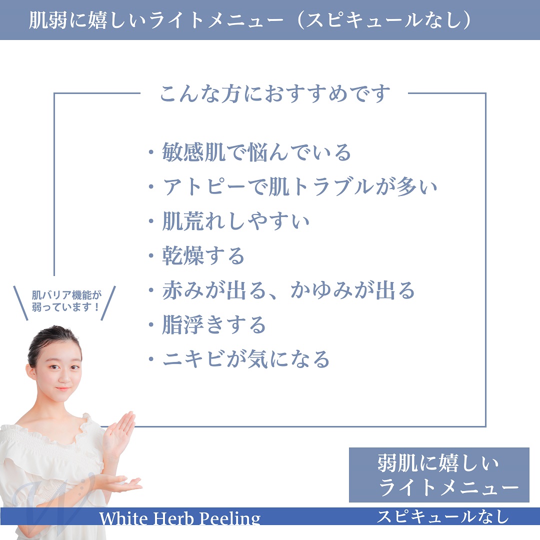 ホワイトハーブピーリングは、超敏感肌(赤み・かゆみ)には「スピキュールなし(ホワイトハーブピーリングライト)」メニューで肌バリア機能再生を促し、徐々にスピキュールの量を増やし、肌強化につなげるプログラムにしています。